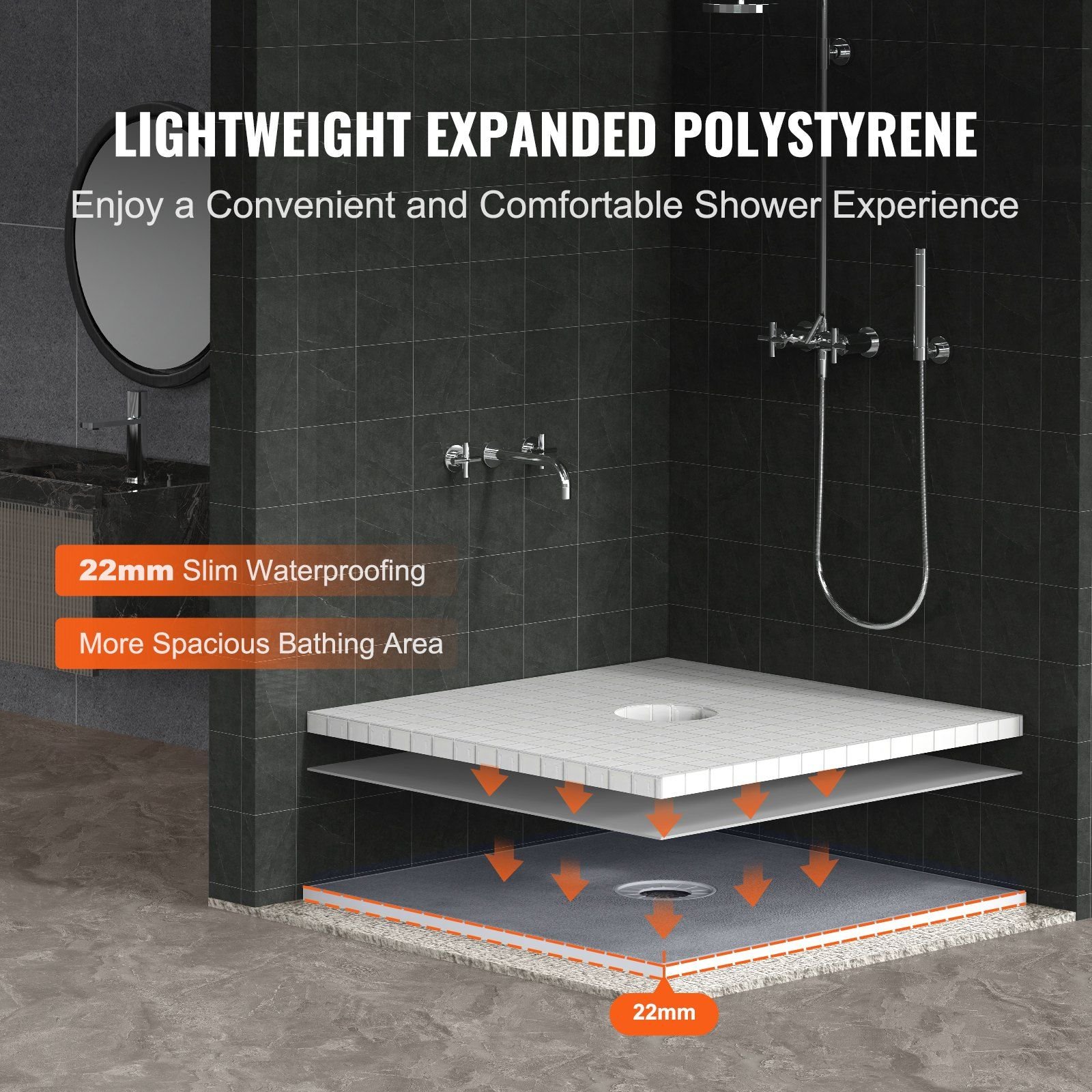 1.Shower Tray 22mm: Enjoy long showers without worries of water leakage. Crafted with high-density HDPE waterproof membrane, double-layer 3M adhesive, and durable EPS board, creating a sturdy waterproof barrier.